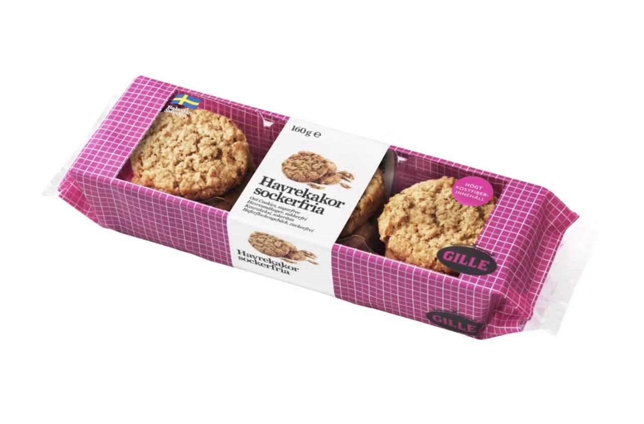margarin (vegetabiliska fetter och oljor (palm*, shea, raps, kokos), vatten, salt, emulgeringsmedel: mono- och diglycerider av vegetabiliska fettsyror; naturlig arom, antioxidationsmedel: citronsyra), HAVREGRYN 27 %, sötningsmedel: maltitoler**; VETEMJÖL, HAVREFIBER 5,2 %, bakpulver: ammoniumkarbonater, natriumkarbonater; salt, naturlig arom. Kan innehålla spår av ägg, mjölk och mandel. *Hållbart producerad och certifierad. **Överdriven konsumtion kan ha laxerande effekt.
